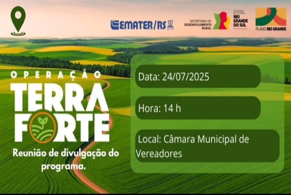 A EMATER e a Secretaria Municipal de Desenvolvimento do Agronegócio de Tupanciretã promovem, no dia 24 de julho, às 14h, na Câmara de Vereadores, uma reunião de divulgação do Programa de Recuperação Socioprodutiva e Ambiental e Incremento da Resiliência Climática da Agricultura Familiar Gaúcha – Operação Terra Forte.