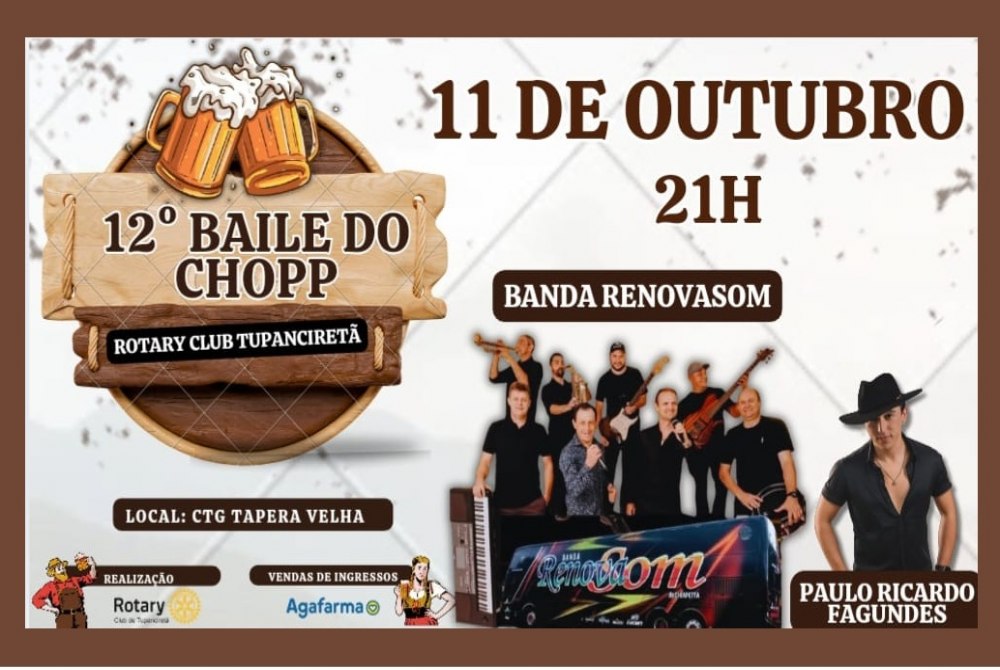 O Rotary Club de Tupanciretã realiza no próximo sábado, dia 11 de outubro de 2025, o 12º Baile do Chopp, evento beneficente que ocorre no CTG Tapera Velha (Rua Borges do Canto, 492 – Centro, Tupanciretã), a partir das 21h, com encerramento previsto para as 5h da manhã.