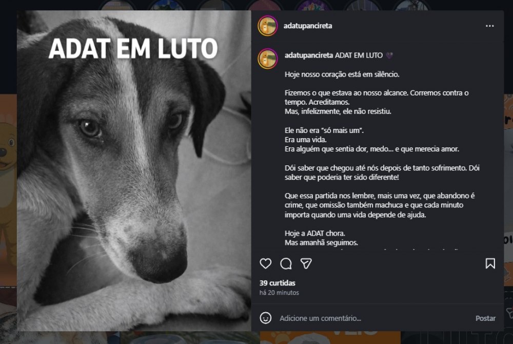 Em publicação nas redes sociais, a entidade manifestou luto e reforçou o alerta sobre a responsabilidade com os animais. No texto, a ADAT destacou que “abandono é crime” e que a omissão também causa sofrimento, reiterando o compromisso de seguir atuando na causa animal no município.